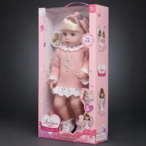 Muñeca de Colección 55 cm – Con Sonido y Accesorios de Cuidado 👶💕🎀 Hermosa bebé con cabello rubio peinable, vestido tejido rosa y rostro realista con ojos expresivos. Incluye biberón, pañal y cepillo. Emite sonidos tiernos. Ideal para niñas desde 3 años que aman jugar a ser mamá. Calidad y respaldo de Distribuidores La Meka.