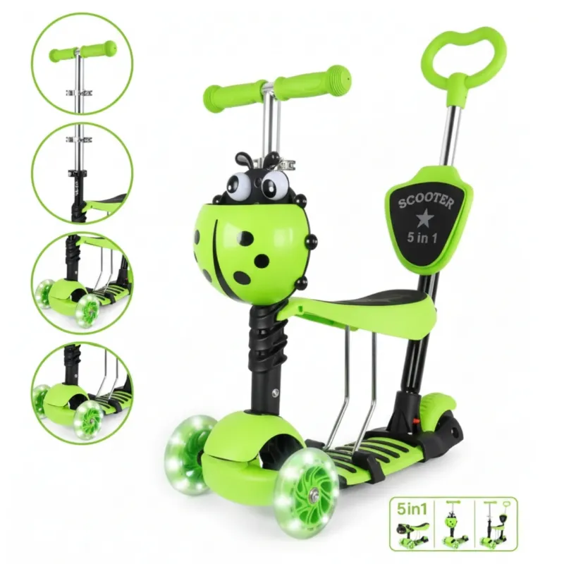 La Patineta Scooter 5 en 1 Infantil 🛴💚 es la opción perfecta para acompañar a tu hijo en cada etapa de su crecimiento. Diseñada para niños desde los 2 años, este scooter evolutivo se adapta fácilmente, permitiendo pasar de correpasillos a patineta tradicional de manera progresiva y segura. Su diseño tipo mariquita encanta a los pequeños y genera confianza desde el primer uso.