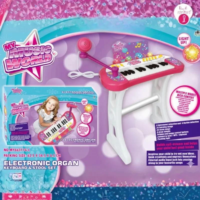 Diseñado para inspirar creatividad y expresión artística, este órgano electrónico ofrece una experiencia musical completa con 4 sonidos de instrumentos, 4 ritmos diferentes, 24 canciones de aprendizaje, 38 demos y la posibilidad de conectar un celular o reproductor MP3 para cantar con sus canciones favoritas. Las luces LED que parpadean al ritmo de la música convierten cada sesión en un show de luces digno de una verdadera estrella pop.