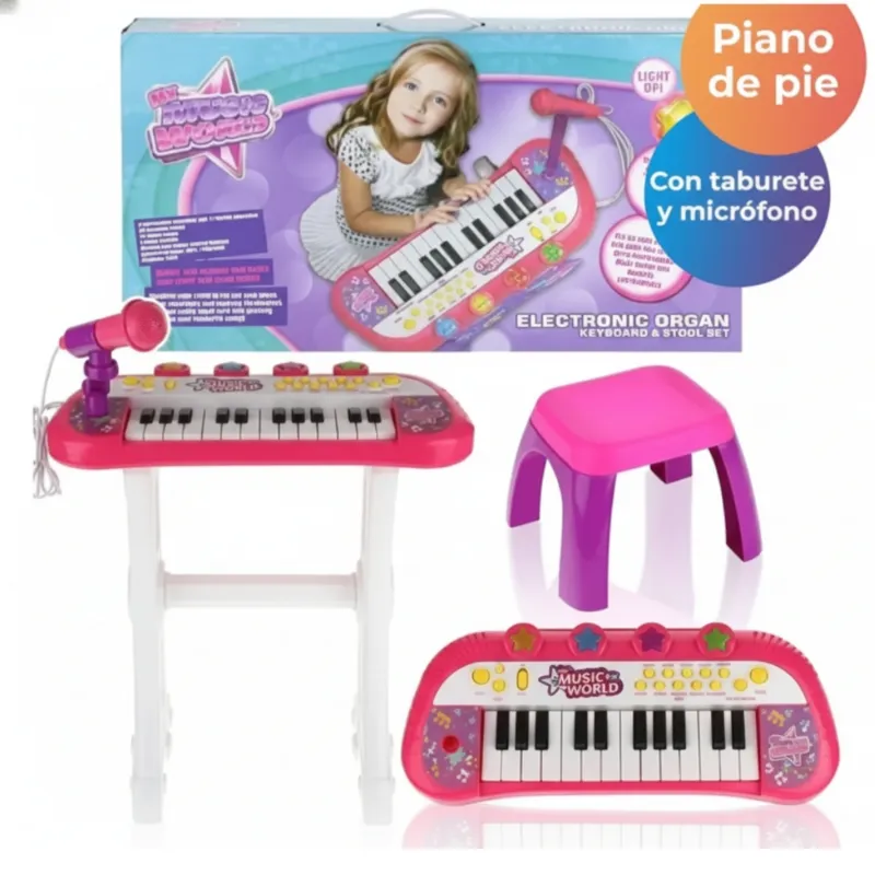 El Piano Electrónico My Music World en Rosa 🎹💖 es el sueño hecho realidad para las pequeñas músicas de la casa. Este hermoso set en tonos rosa, fucsia y blanco incluye todo lo necesario para crear un verdadero rincón musical: teclado electrónico con múltiples funciones, elegante mueble con base estable, cómodo banquito y micrófono rosa para cantar como una estrella.