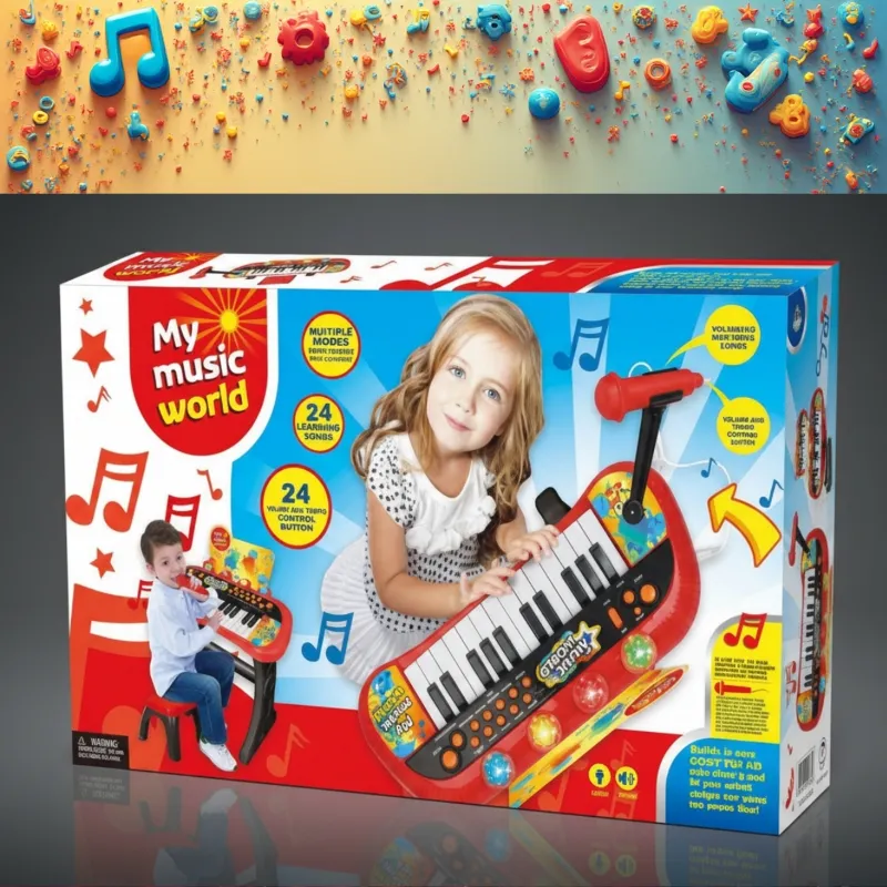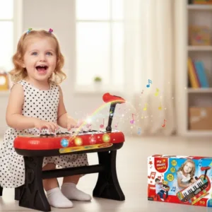 Con un diseño vibrante en colores rojo, negro y amarillo que atrae inmediatamente la atención de los niños, este piano ofrece una experiencia musical completa con 4 sonidos de instrumentos diferentes, 5 ritmos, canciones de aprendizaje, demos y efectos de luces LED que parpadean al ritmo de la música, convirtiendo cada sesión de práctica en un verdadero espectáculo.