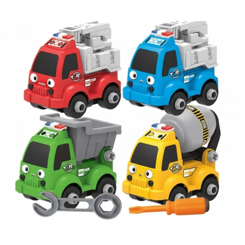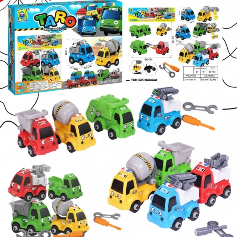 El Set de 4 Carritos Constructores Desarmables TARO 🚧🔧 es el juguete perfecto para pequeños ingenieros y amantes de los vehículos de construcción. Este completo set incluye cuatro adorables camiones de obra con caritas expresivas estilo kawaii, que pueden armarse y desarmarse una y otra vez gracias a las herramientas incluidas.
