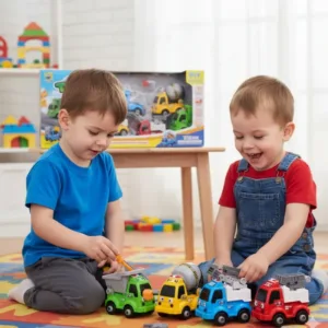 Cada vehículo representa un equipo esencial de construcción: la volqueta roja para transportar materiales, la mezcladora amarilla de cemento, el camión verde de reciclaje y la grúa azul con plataforma elevadora. Los colores vibrantes y los rostros amigables hacen que los niños se conecten emocionalmente con sus “amigos de la construcción” mientras aprenden sobre mecánica básica.